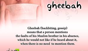 Backbiting (gheebah) means mentioning something about a person (in his absence), that he hates (to have mentioned), whether it is about: His body, his religious characteristics, his worldly affairs, his self, his physical appearance, his character, his wealth, his child, his father, his wife, his manner of walking, his smile, it is the same whether you mention that about him with words, through writings, or whether you point or indicate him by gesturing with your eyes, hand or head.